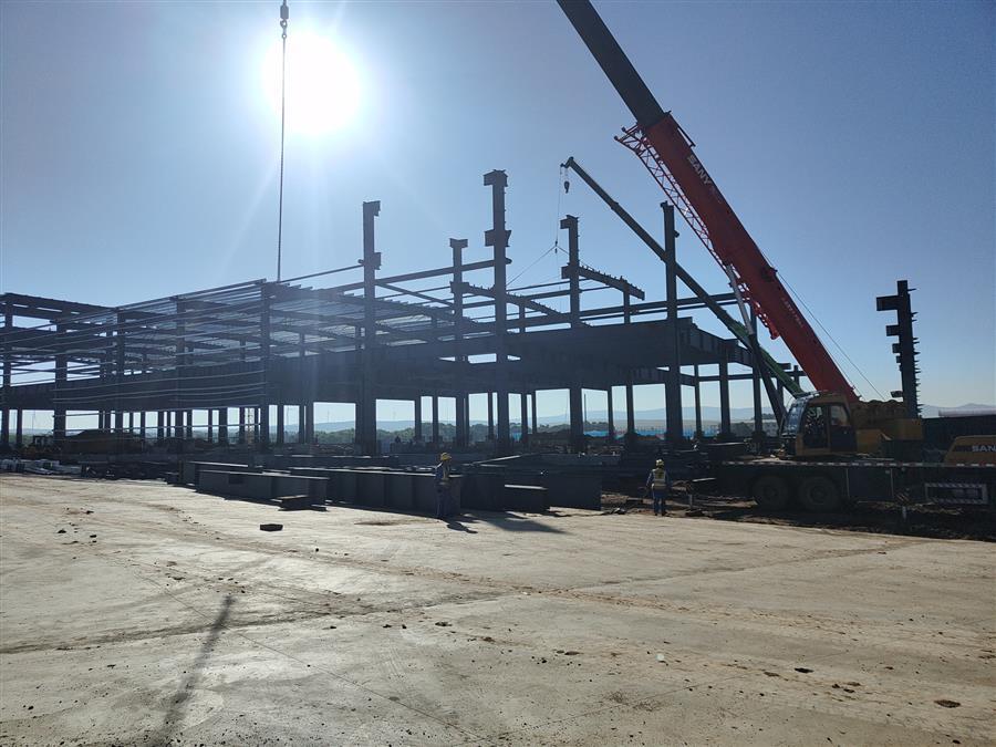 目前,該項(xiàng)目2#配送中心5-12軸鋼結(jié)構(gòu)完成100%,正在進(jìn)行1-4軸二層鋼柱牛腿焊接、6.65米鋼梁安裝及二層鋼柱安裝。2#冷庫4-12軸交E交J軸防水板混凝土澆筑完成,正在加固13-18軸地下室頂板模板,綁扎4-12軸交A交E軸防水板鋼筋。